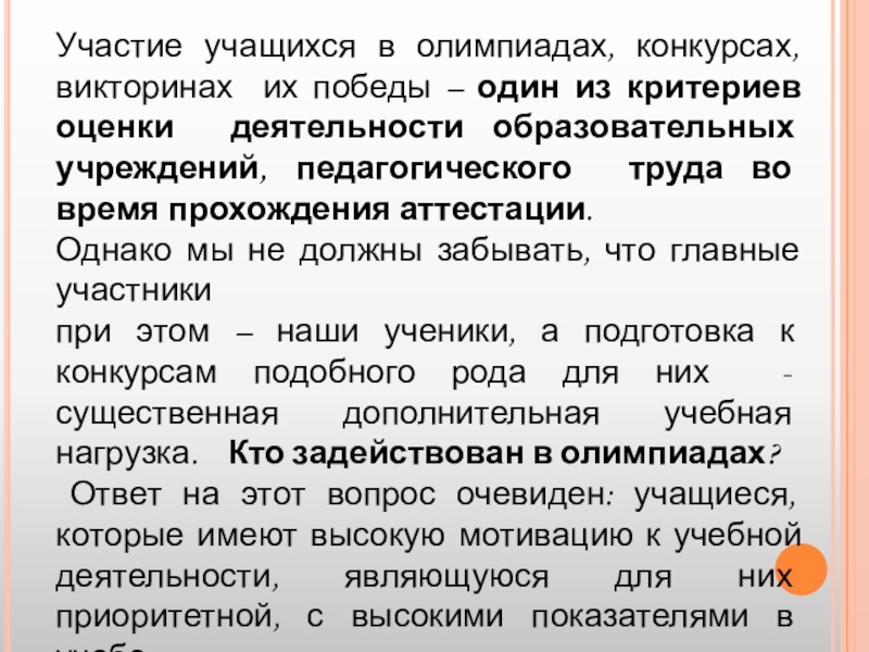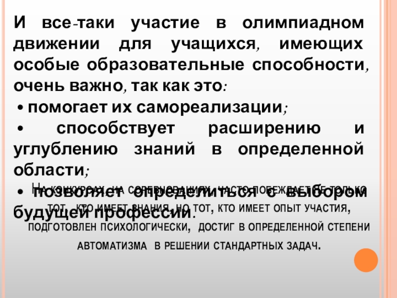 На конкурсах, на соревнованиях, часто побеждает не только тот, кто имеет знания, но тот, кто имеет опыт участия, подготовлен психологически, достиг в определенной степени автоматизма в решении стандартных задач.