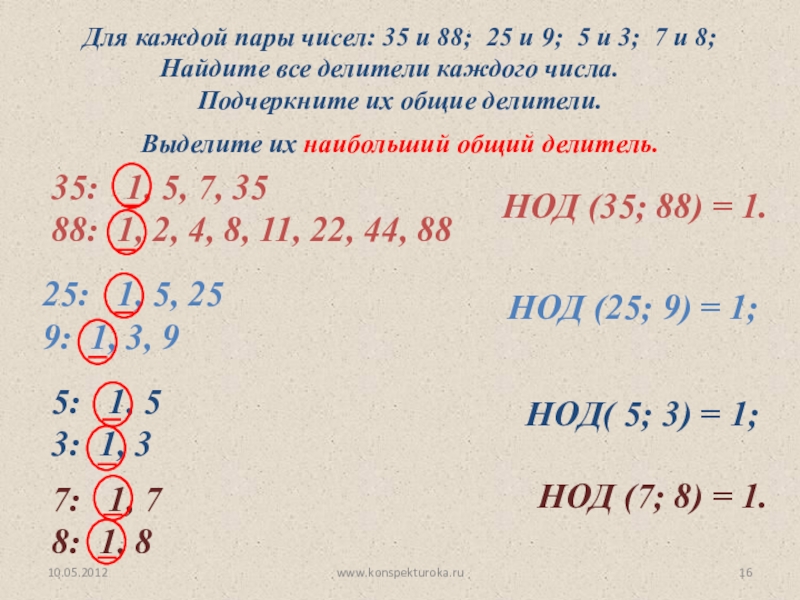 Для каждой пары чисел: 35 и 88; 25 и 9; 5 и 3; 7 и 8;