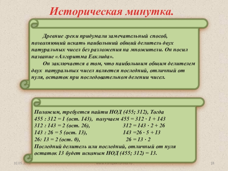 455 : 312 = 1 (ост. 143), получаем 455 = 312 ∙ 1 + 143
