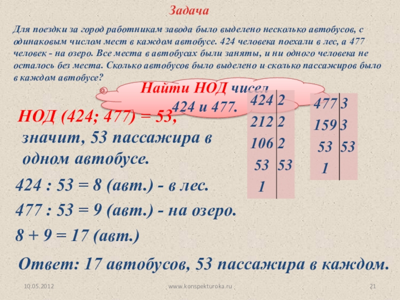 Для поездки за город работникам завода было выделено несколько автобусов, с одинаковым числом мест в каждом автобусе. 424 человека поехали в лес, а 477 человек - на озеро. Все места в автобусах были заняты, и ни одного человека не осталось без места. Сколько автобусов было выделено и сколько пассажиров было в каждом автобусе?