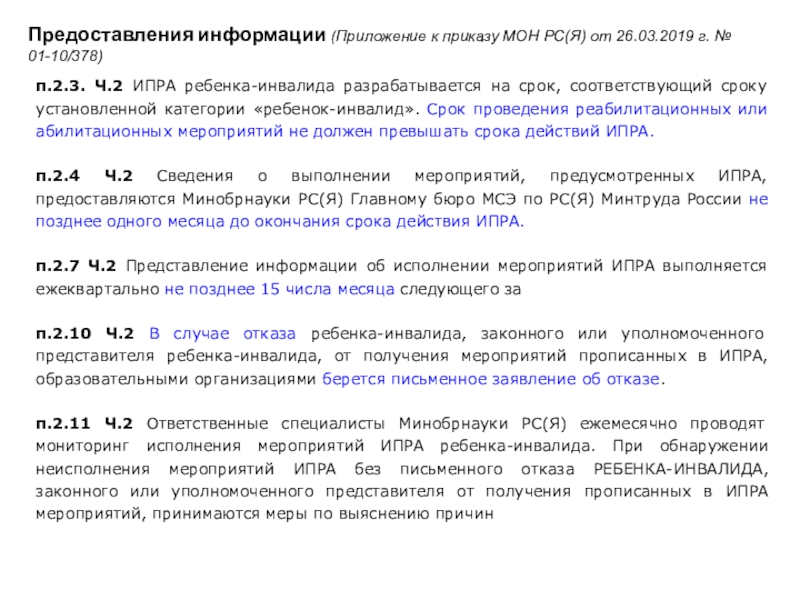 п.2.11 Ч.2 Ответственные специалисты Минобрнауки РС(Я) ежемесячно проводят мониторинг исполнения мероприятий ИПРА ребенка-инвалида. При обнаружении неисполнения мероприятий ИПРА без письменного отказа РЕБЕНКА-ИНВАЛИДА, законного или уполномоченного представителя от получения прописанных в ИПРА мероприятий, принимаются меры по выяснению причин