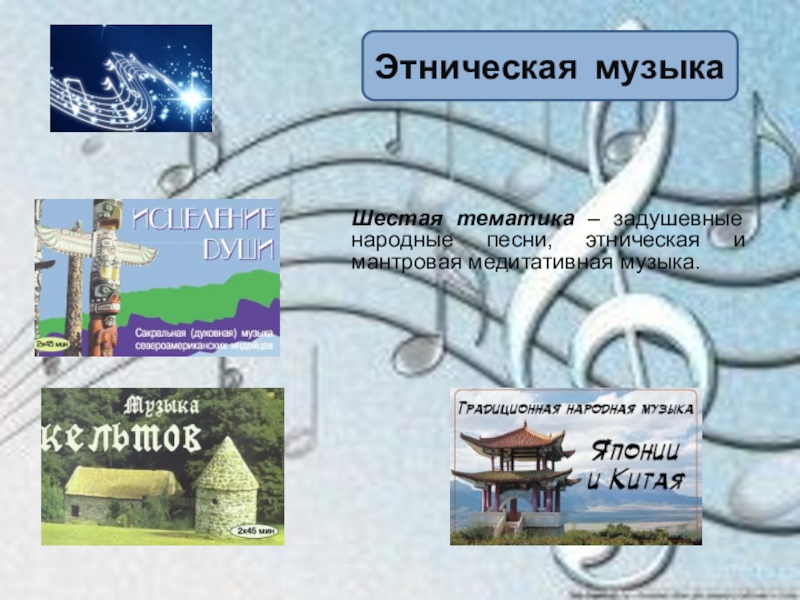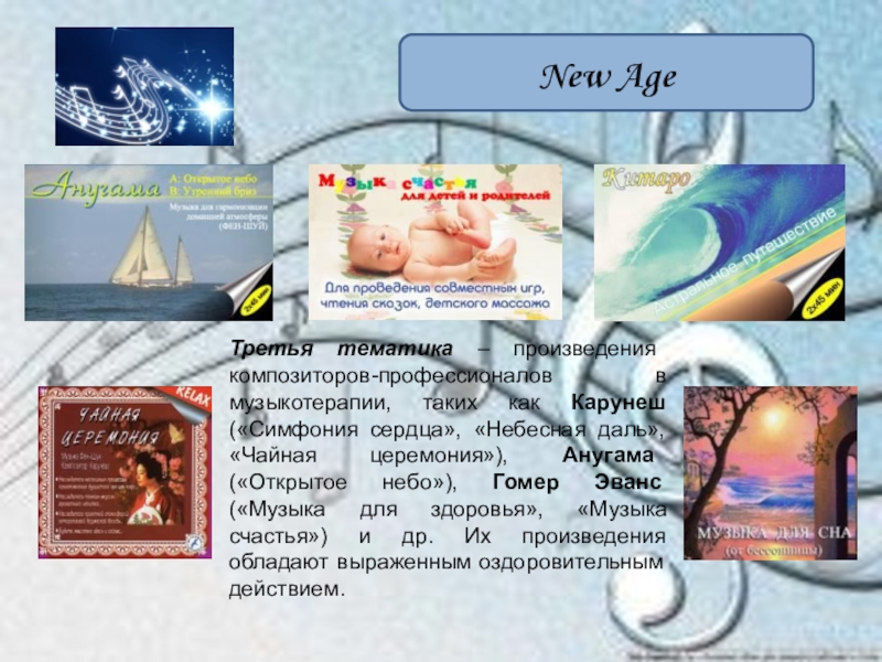 Третья тематика – произведения композиторов-профессионалов в музыкотерапии, таких как Карунеш