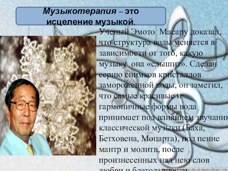 Ученый Эмото Масару доказал, что структура воды меняется в зависимости от того, какую музыку она «слышит». Сделав серию снимков кристаллов замороженной воды, он заметил, что самые красивые и гармоничные формы вода принимает под влиянием звучания классической музыки (Баха, Бетховена, Моцарта), под пение мантр и молитв, после произнесенных над нею слов любви и благодарности.