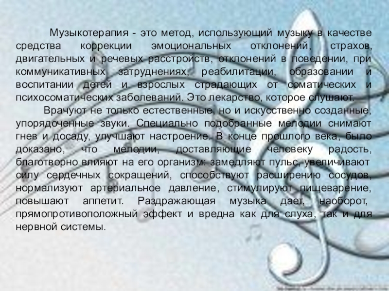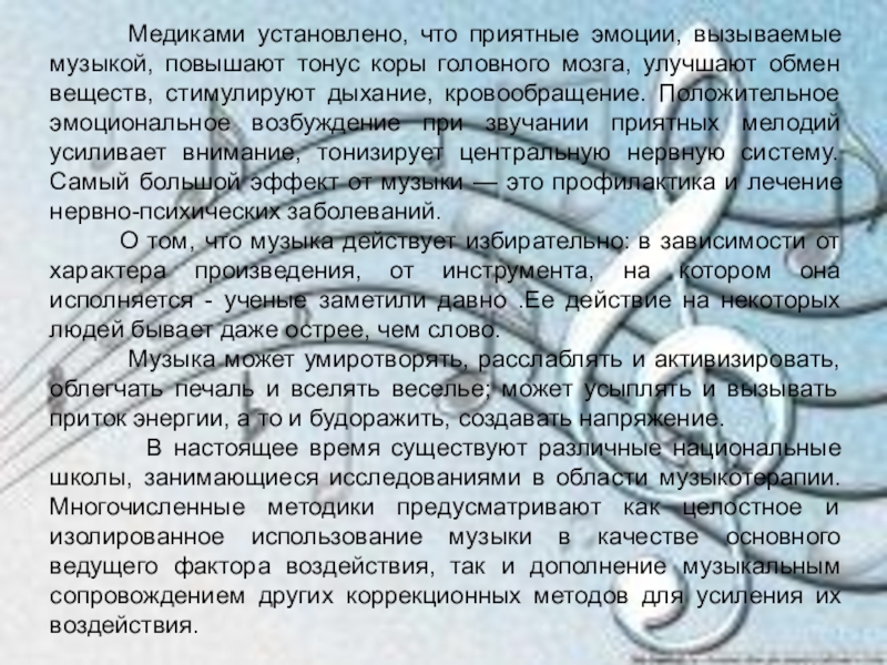 повышают тонус коры головного мозга, улучшают обмен веществ, стимулируют дыхание, кровообращение. Положительное эмоциональное возбуждение при звучании приятных мелодий усиливает внимание, тонизирует центральную нервную систему. Самый большой эффект от музыки — это профилактика и лечение нервно-психических заболеваний.