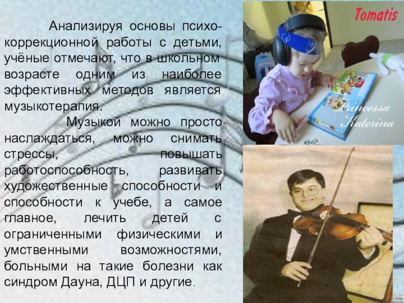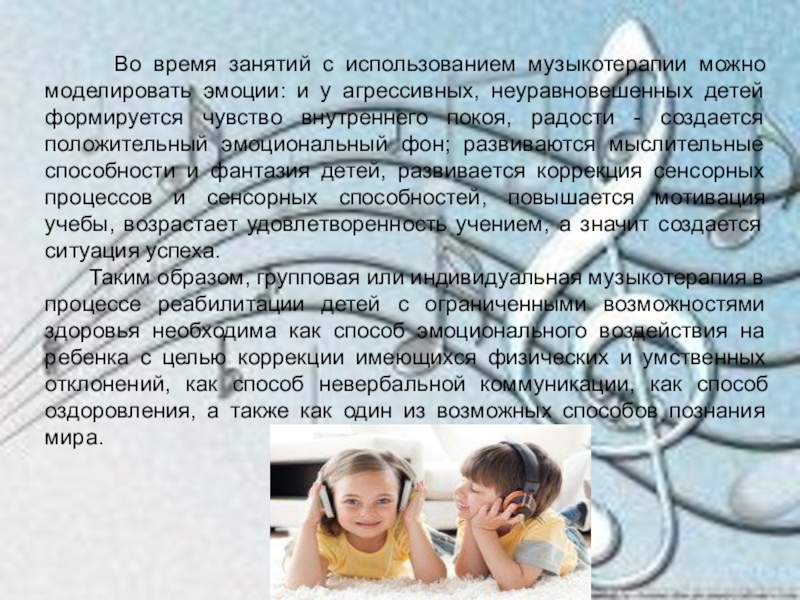 Музыкой можно просто наслаждаться, можно снимать стрессы, повышать работоспособность, развивать художественные способности и способности к учебе, а самое главное, лечить детей с ограниченными физическими и умственными возможностями, больными на такие болезни как синдром Дауна, ДЦП и другие.