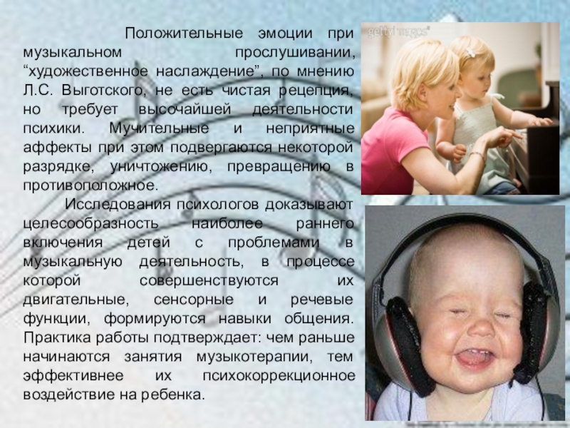 Исследования психологов доказывают целесообразность наиболее раннего включения детей с проблемами в музыкальную деятельность, в процессе которой совершенствуются их двигательные, сенсорные и речевые функции, формируются навыки общения. Практика работы подтверждает: чем раньше начинаются занятия музыкотерапии, тем эффективнее их психокоррекционное воздействие на ребенка.