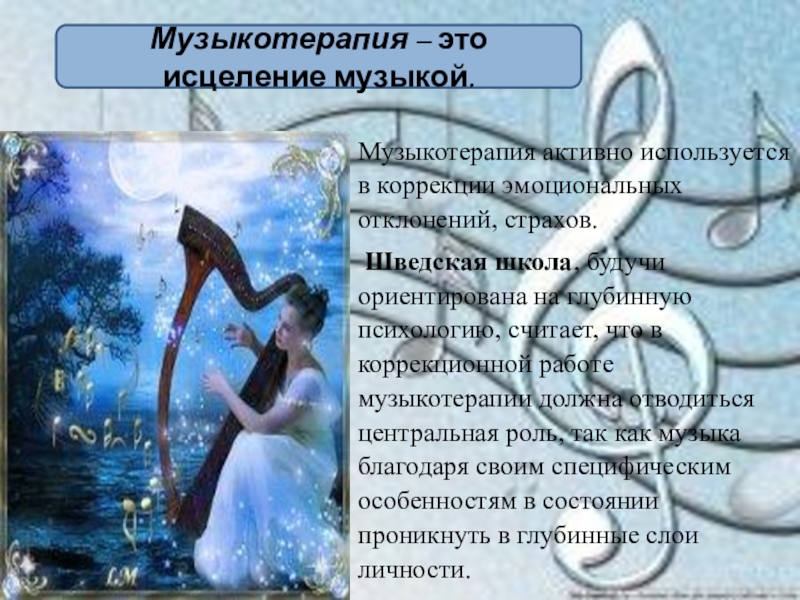 Шведская школа, будучи ориентирована на глубинную психологию, считает, что в коррекционной работе музыкотерапии должна отводиться центральная роль, так как музыка благодаря своим специфическим особенностям в состоянии проникнуть в глубинные слои личности.