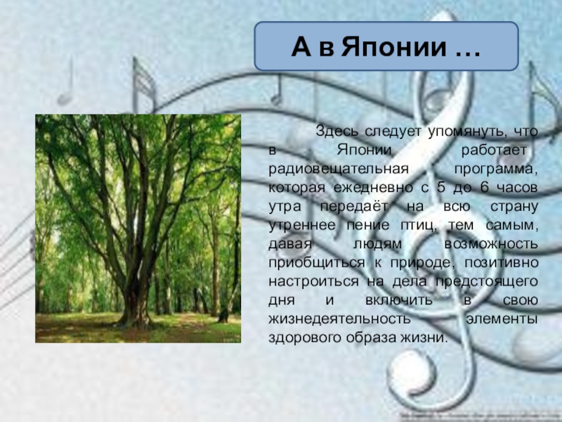 радиовещательная программа, которая ежедневно с 5 до 6 часов утра передаёт на всю страну утреннее пение птиц, тем самым, давая людям возможность приобщиться к природе, позитивно настроиться на дела предстоящего дня и включить в свою жизнедеятельность элементы здорового образа жизни.
