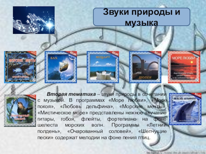 природы в сочетании с музыкой. В программах «Море любви», «Море покоя», «Любовь дельфина», «Морские мечты», «Мистическое море» представлены нежное звучание гитары, гобоя, флейты, фортепиано на фоне шелеста морских волн. Программы «Летний полдень», «Очарованный соловей», «Шепчущие пески» содержат мелодии на фоне пения птиц.