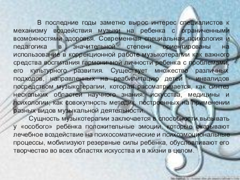 заметно вырос интерес специалистов к механизму воздействия музыки на ребенка с ограниченными возможностями здоровья. Современная специальная психология и педагогика в значительной степени ориентированы на использование в коррекционной работе музыкотерапии как важного средства воспитания гармоничной личности ребенка с проблемами, его культурного развития. Существует множество различных подходов, направленных на реабилитацию детей - инвалидов посредством музыкотерапии, которая рассматривается, как синтез нескольких областей научного знания: искусства, медицины и психологии; как совокупность методик, построенных на применении разных видов музыкальной деятельности.