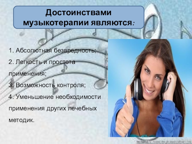 (пассивная) отличается тем, что человек в процессе музыко-терапевтического сеанса не принимает в нем активного участия, занимая позицию простого слушателя. Ему предлагают прослушать различные музыкальные композиции либо вслушиваться в различные звучания, отвечающие состоянию его психического здоровья.