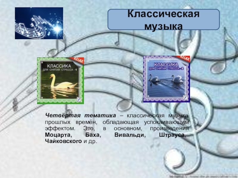 Четвёртая тематика – классическая музыка прошлых времён, обладающая успокаивающим эффектом.
