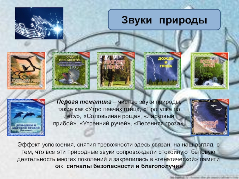 с тем, что все эти природные звуки сопровождали спокойную бытовую деятельность многих поколений и закрепились в «генетической» памяти как сигналы безопасности и благополучия