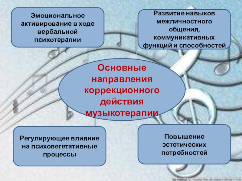 В настоящее время существуют различные национальные школы, занимающиеся исследованиями в области музыкотерапии. Многочисленные методики предусматривают как целостное и изолированное использование музыки в качестве основного ведущего фактора воздействия, так и дополнение музыкальным сопровождением других коррекционных методов для усиления их воздействия.