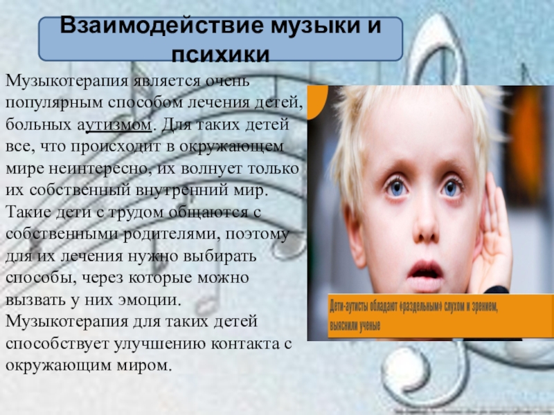 популярным способом лечения детей, больных аутизмом. Для таких детей все, что происходит в окружающем мире неинтересно, их волнует только их собственный внутренний мир. Такие дети с трудом общаются с собственными родителями, поэтому для их лечения нужно выбирать способы, через которые можно вызвать у них эмоции. Музыкотерапия для таких детей способствует улучшению контакта с окружающим миром.