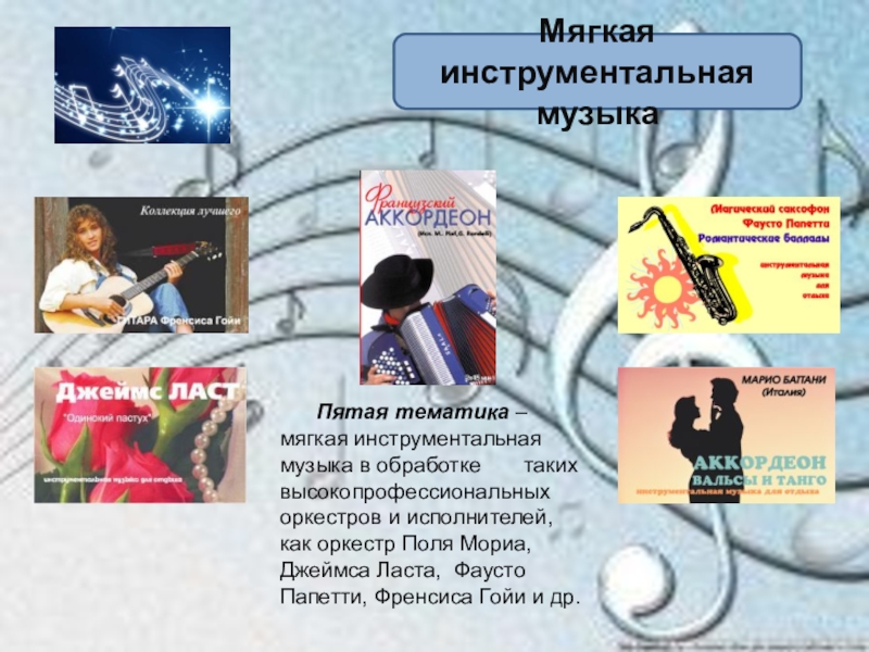 в обработке таких высокопрофессиональных оркестров и исполнителей, как оркестр Поля Мориа, Джеймса Ласта, Фаусто Папетти, Френсиса Гойи и др.