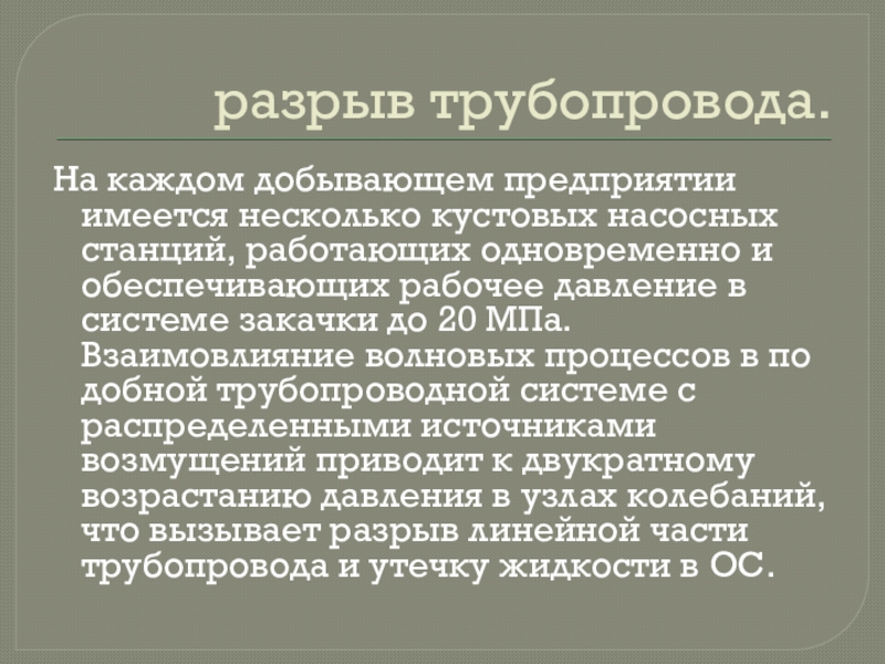 разрыв трубопровода.На каждом добывающем предприятии имеется несколько кустовых насос­ных станций, работающих одновременно и обеспечивающих рабочее давле­ние в