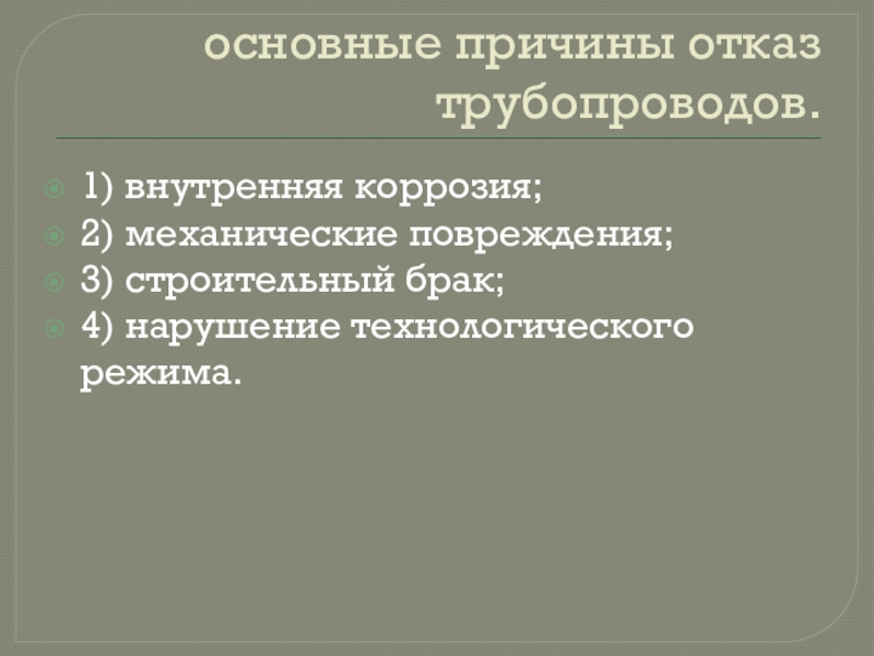 основные причины отказ трубопроводов.1) внутренняя коррозия;2) механические повреждения;3) строительный брак;4) нарушение технологического режима.