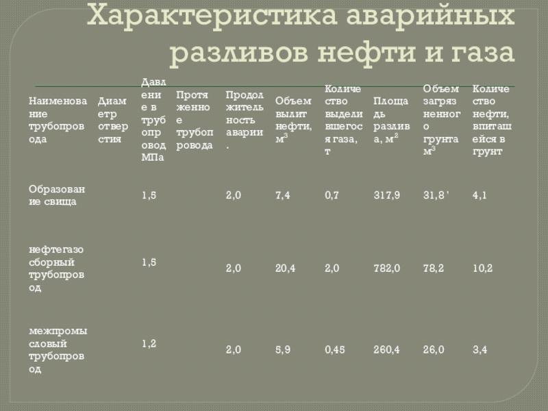 Слайд 9Характеристика аварийных разливов нефти и газа