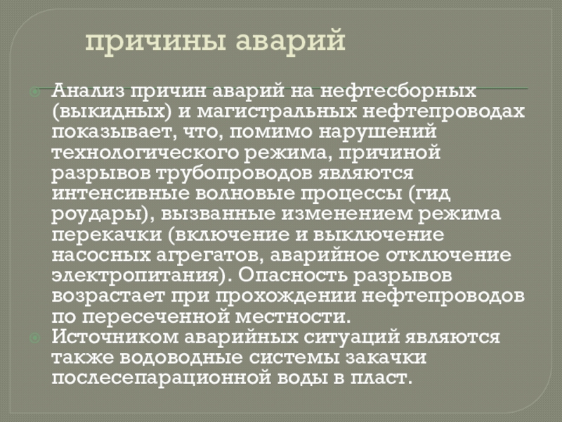 причины аварийАнализ причин аварий на нефтесборных (выкидных) и магистральных нефтепроводах показывает, что, помимо нарушений