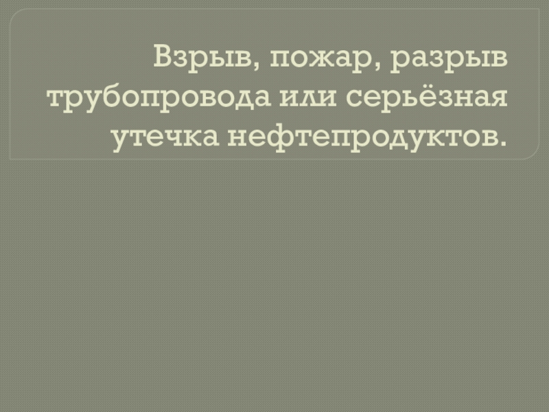 Слайд 1Взрыв, пожар, разрыв трубопровода или серьёзная утечка нефтепродуктов.