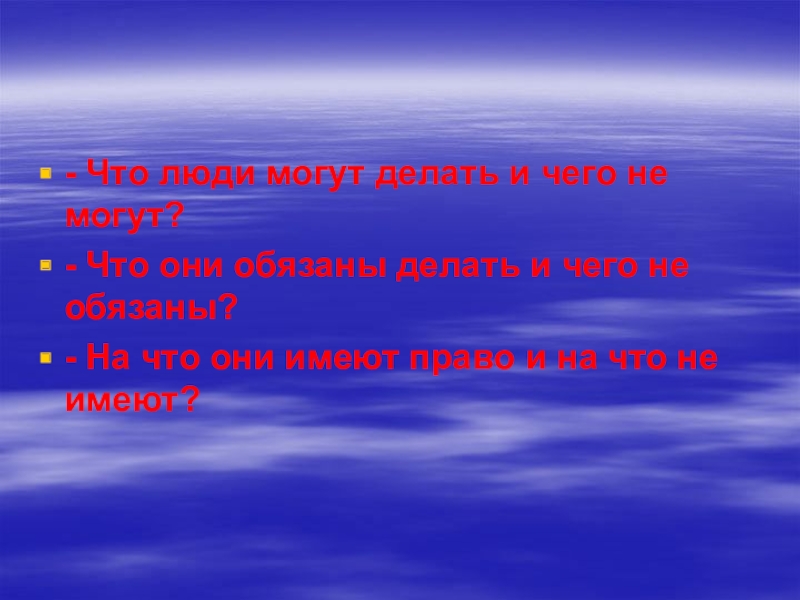 - Что люди могут делать и чего не могут?- Что они обязаны делать и чего не обязаны?- На что они имеют право и на что не имеют?