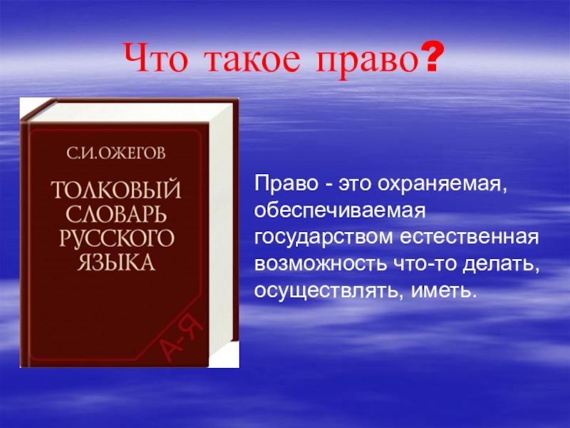 Что такое право?Право - это охраняемая, обеспечиваемая государством естественная возможность что-то делать, осуществлять, иметь.