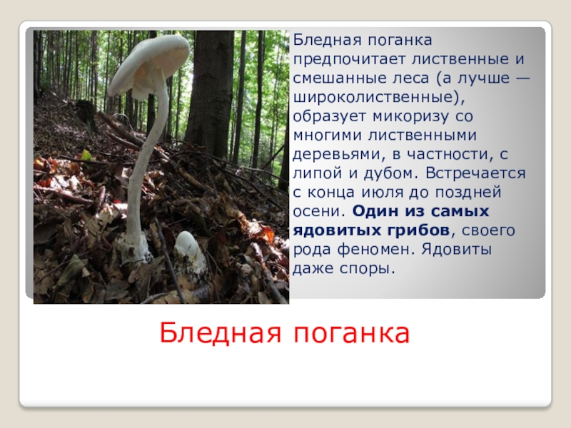 Бледная поганкаБледная поганка предпочитает лиственные и смешанные леса (а лучше — широколиственные), образует микоризу со многими лиственными