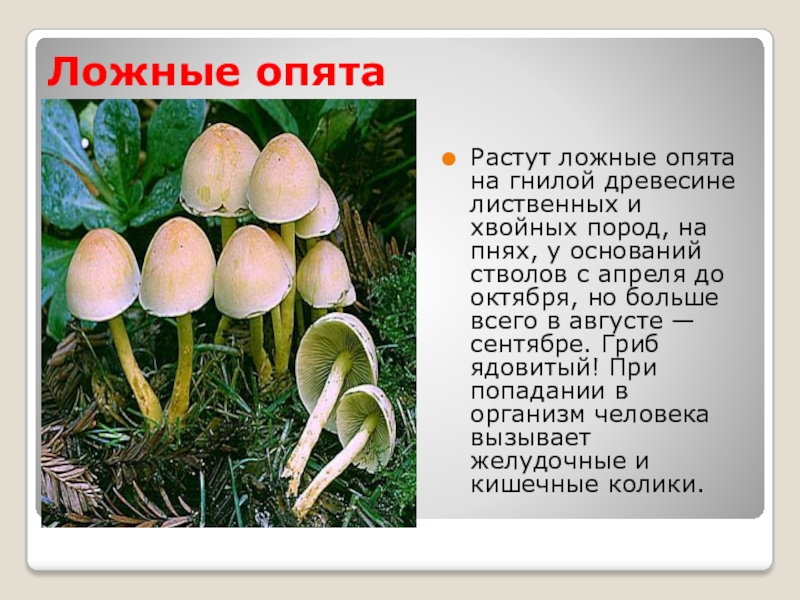 Ложные опятаРастут ложные опята на гнилой древесине лиственных и хвойных пород, на пнях, у оснований стволов с