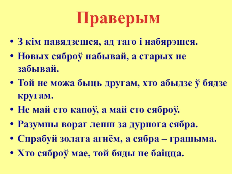 ПраверымЗ кім павядзешся, ад таго і набярэшся.Новых сяброў набывай, а старых не забывай.Той не можа быць другам,