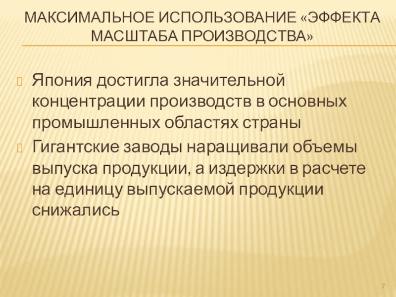 Слайд 7Максимальное использование «эффекта масштаба производства»