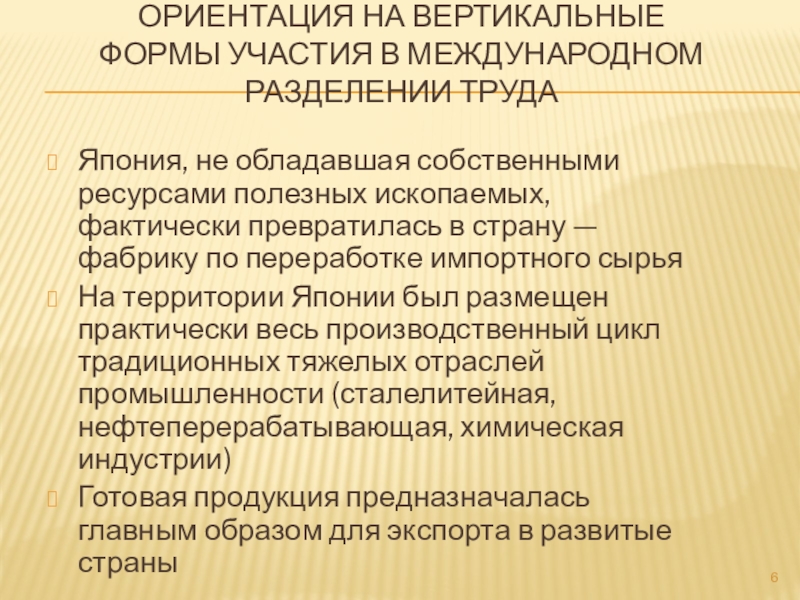 Слайд 6Ориентация на вертикальные формы участия в международном разделении труда