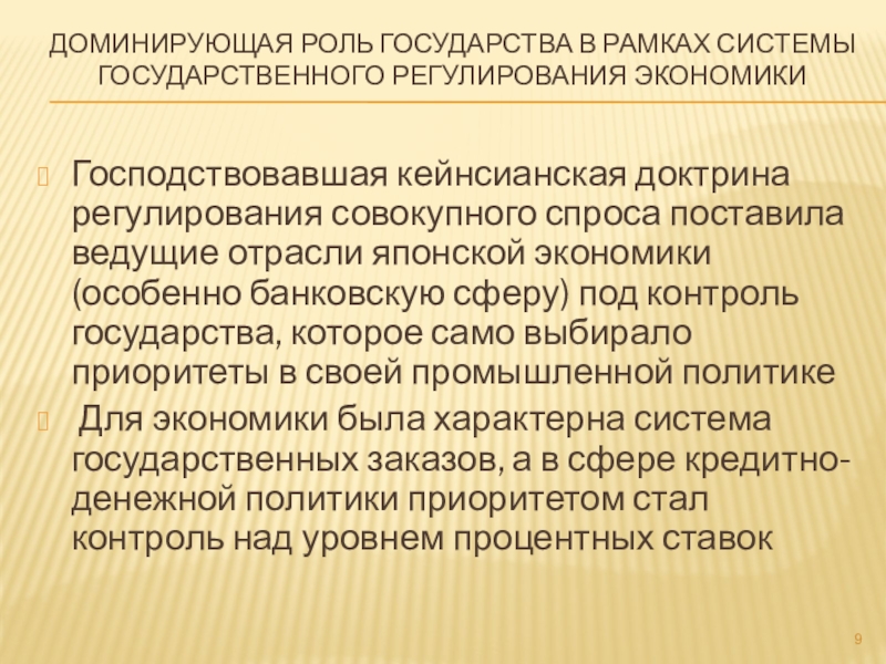 регулирования совокупного спроса поставила ведущие отрасли японской экономики (особенно банковскую сферу) под контроль государства, которое само выбирало приоритеты в своей промышленной политике