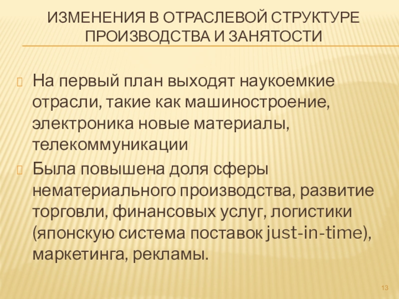 Была повышена доля сферы нематериального производства, развитие торговли, финансовых услуг, логистики (японскую система поставок just-in-time), маркетинга, рекламы.