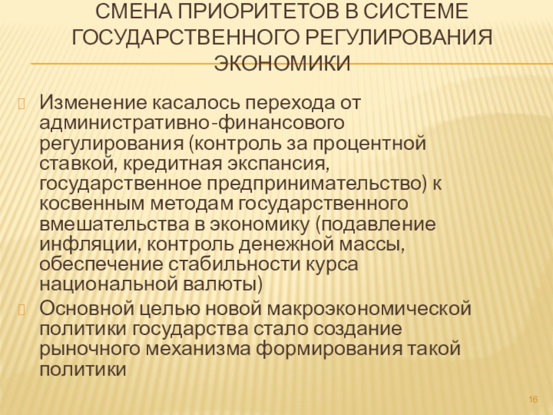 Слайд 16Смена приоритетов в системе государственного регулирования экономики