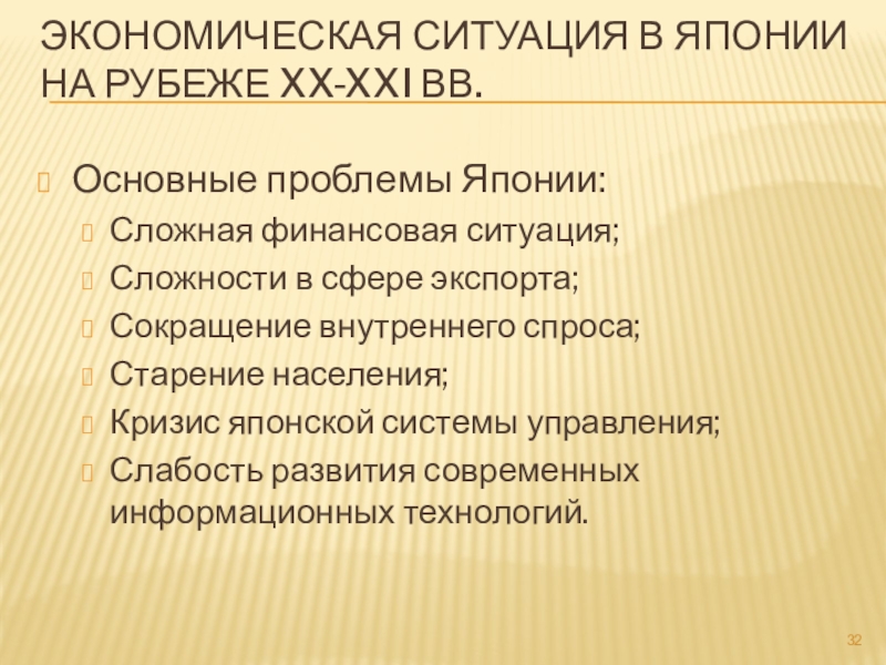 Слайд 32Экономическая ситуация в Японии на рубеже XX-XXI вв.