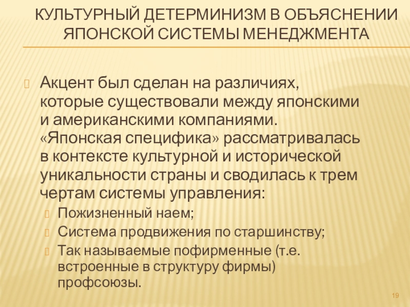 Слайд 19Культурный детерминизм в объяснении японской системы менеджмента
