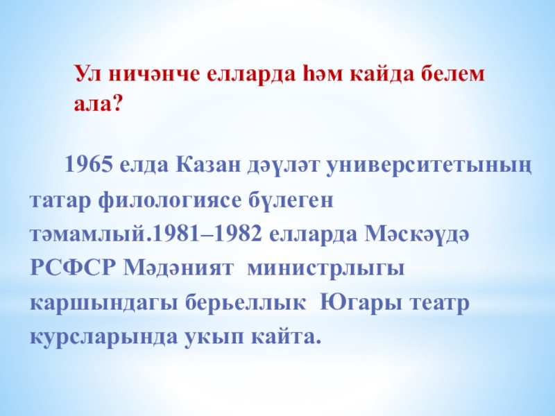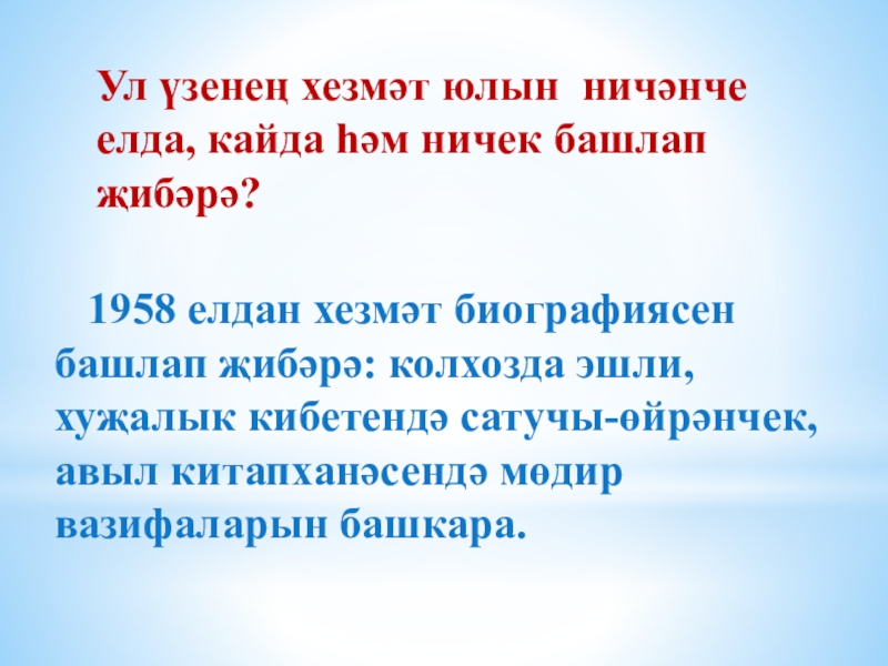 1958 елдан хезмәт биографиясен башлап җибәрә: колхозда эшли, хуҗалык кибетендә сатучы-өйрәнчек, авыл китапханәсендә мөдир вазифаларын башкара.