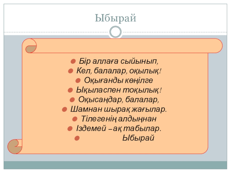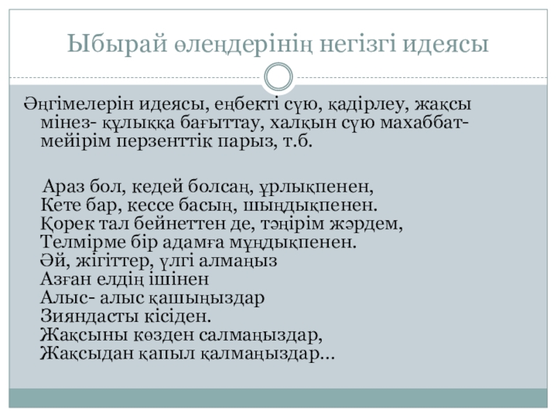 Слайд 9Ыбырай өлеңдерінің негізгі идеясы