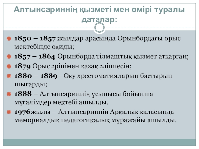 Слайд 4Алтынсариннің қызметі мен өмірі туралы даталар:
