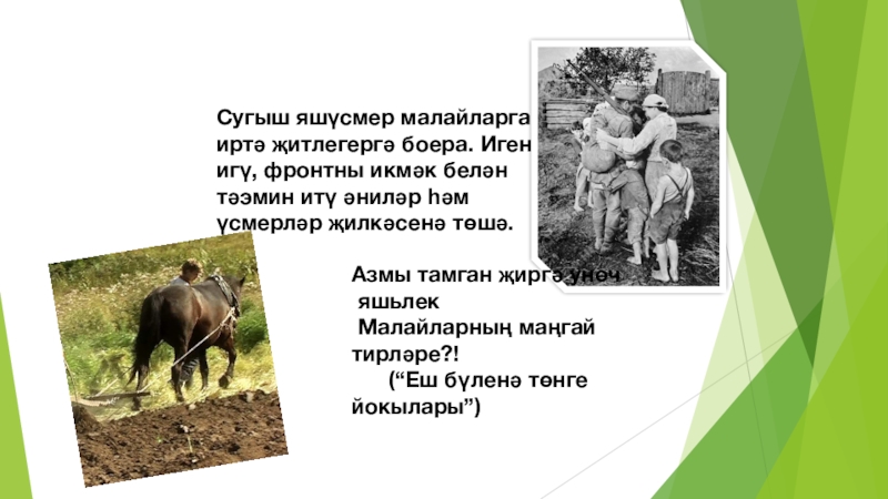 Слайд 11Сугыш яшүсмер малайларга иртә җитлегергә боера. Иген игү, фронтны икмәк белән