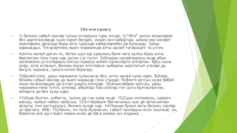 дигән кешеләрне без карточкаларда гына күреп белдек, күмәч яки кабартма, шикәр яки конфет ишеләрнең дөньяда бары-югы турында хәбәрләребез дә булмады. 3)Аңа карамадык, Тегәрҗепнең яшел чирәмендә алты малай тәгәрәшеп тә үстек.
