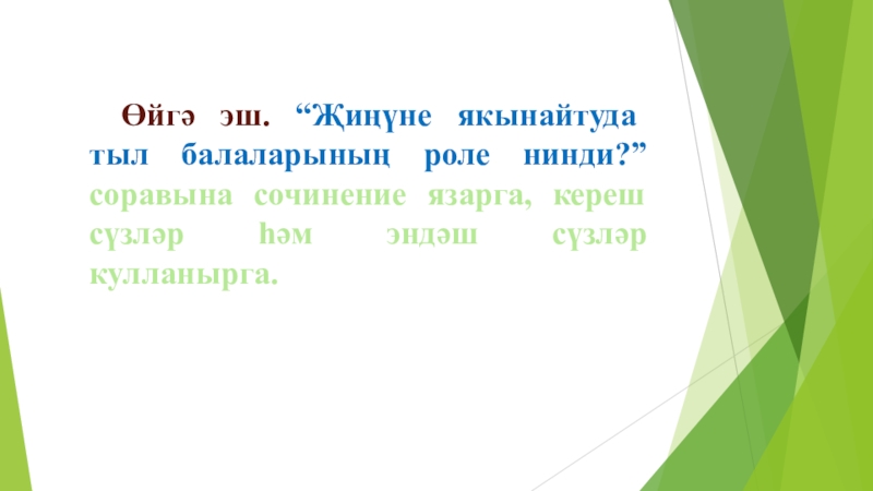 Слайд 14Өйгә эш. “Җиңүне якынайтуда тыл балаларының роле нинди?” соравына сочинение язарга,