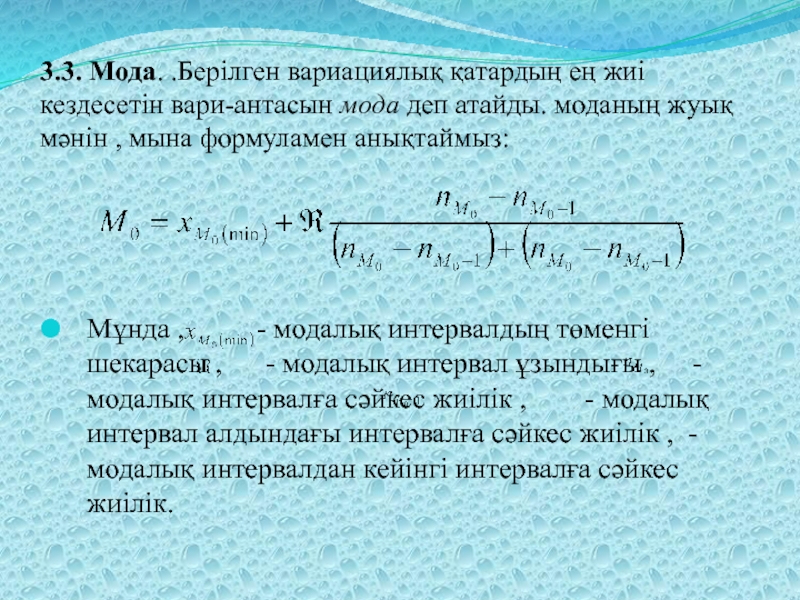Мұнда , - модалық интервалдың төменгі шекарасы , - модалық интервал ұзындығы , -модалық интервалға сәйкес жиілік , - модалық интервал алдындағы интервалға сәйкес жиілік , -модалық интервалдан кейінгі интервалға сәйкес жиілік.