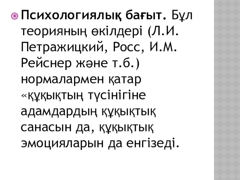 Слайд 10Психологиялық бағыт. Бұл теорияның өкілдері (Л.И.Петражицкий, Росс, И.М.Рейснер және т.б.) нормалармен