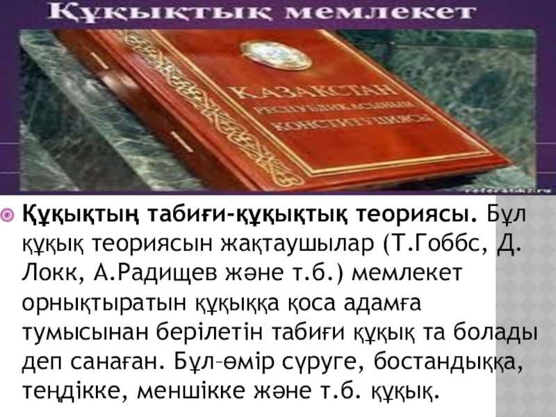 Слайд 6Құқықтың табиғи-құқықтық теориясы. Бұл құқық теориясын жақтаушылар (Т.Гоббс, Д.Локк, А.Радищев және