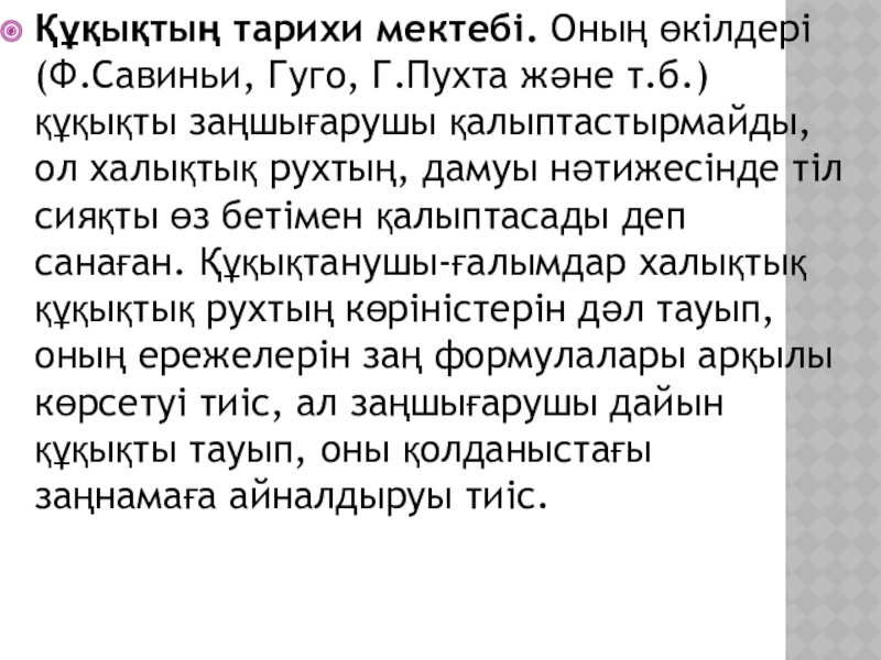 Слайд 9Құқықтың тарихи мектебі. Оның өкілдері (Ф.Савиньи, Гуго, Г.Пухта және т.б.) құқықты