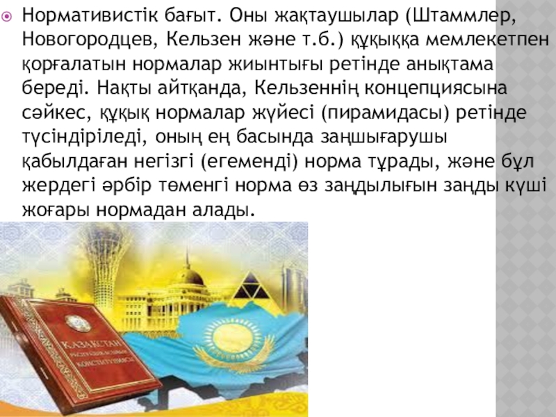 Слайд 3Нормативистік бағыт. Оны жақтаушылар (Штаммлер, Новогородцев, Кельзен және т.б.) құқыққа мемлекетпен