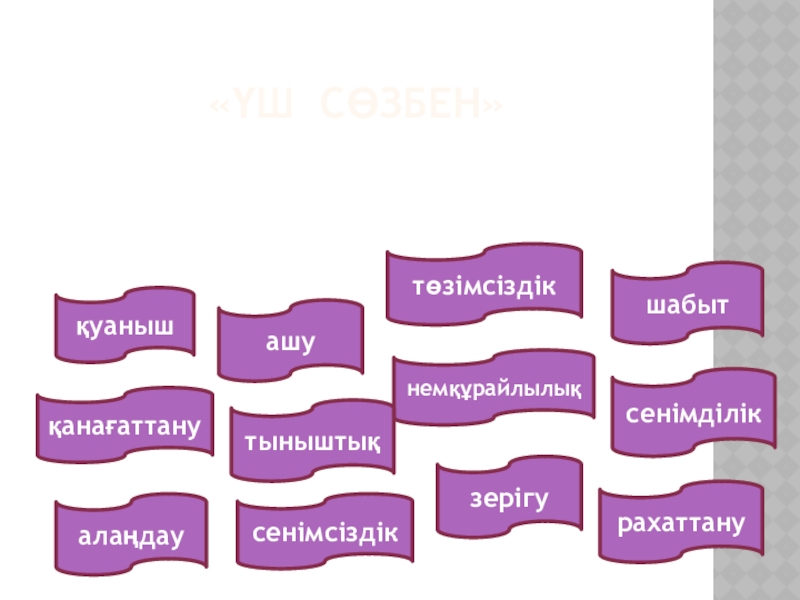 «ҮШ СӨЗБЕН»   қуанышашутөзімсіздікшабытнемқұрайлылыққанағаттануалаңдаутыныштықсенімсіздікзерігусенімділікрахаттану