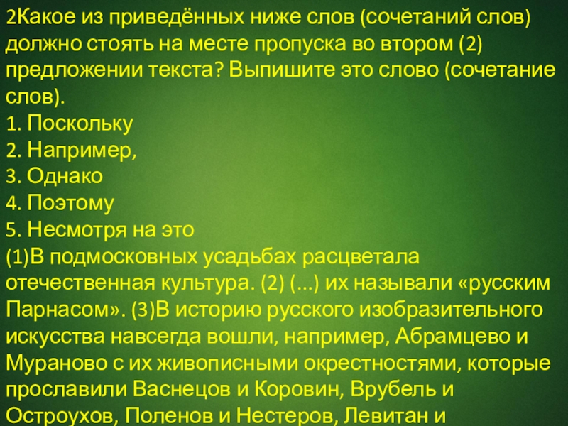 (1)В подмосковных усадьбах расцветала отечественная культура. (2) (...) их называли «русским Парнасом». (3)В историю русского изобразительного искусства навсегда вошли, например, Абрамцево и Мураново с их живописными окрестностями, которые прославили Васнецов и Коровин, Врубель и Остроухов, Поленов и Нестеров, Левитан и Якунчикова.